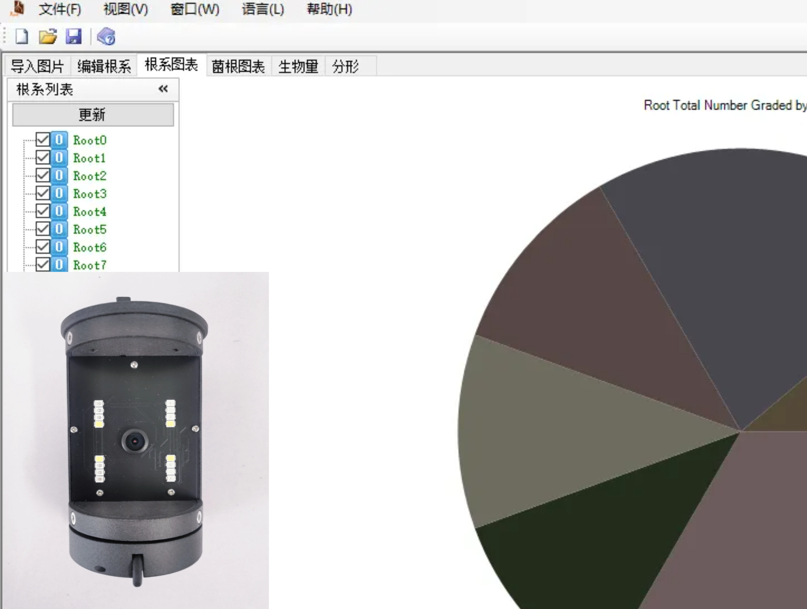 18.根系參數(shù)測定包含根拓撲參數(shù)測定、根系長度、起始直徑、結(jié)束直徑、平均直徑、體積、表面積、分支結(jié)構(gòu)、根系生長速率、根系壽命等參數(shù);功能上具有RHS 和UCL彩色模式、豐富快捷鍵、多語言模式、信息編輯、輔助標定等功能;